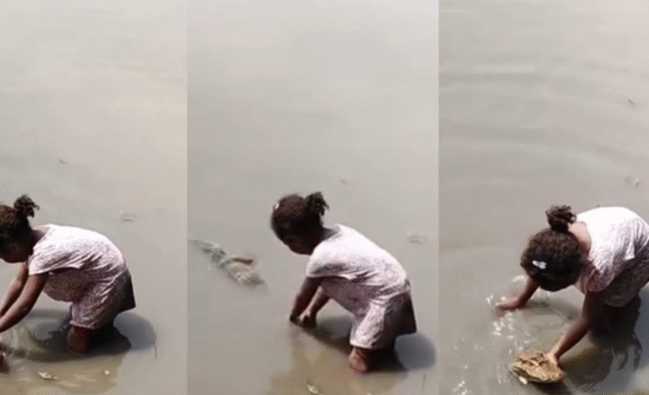 वीडियो में एक छोटी बच्ची नदी में खड़े होकर एक मगरमच्छ को हाथों से प्यार से सहलाती नजर...