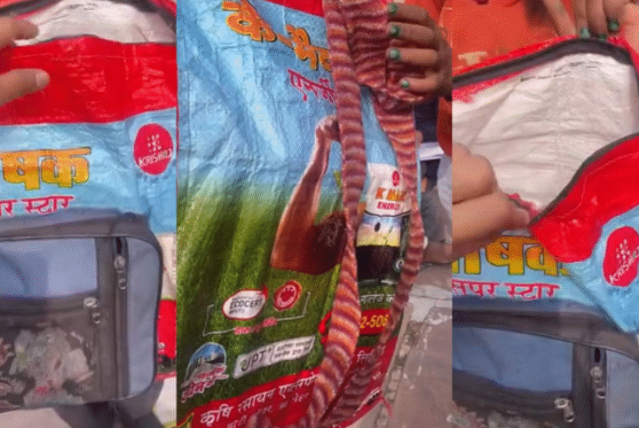 वीडियो की शुरुआत में एक बच्ची अनाज के झोले से बना अपना स्कूल बैग दिखाती है। बच्ची की...